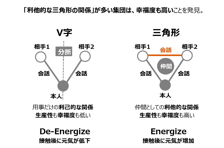 メンバーの幸福度が高い組織はどのような組織であるか、それを矢野さんは突き止めた。以前からコミュニケーションや人の繋がりが幸せにとって重要であるという研究はあったが、彼の研究結果では、組織のコミュニケーション量は幸せとは関係がなかった。しかし、下図のように、ある人にとってよく話しをする二人が、その二人の間でも会話があるという3角形の関係がある人は幸福度が高く、逆に二人の間に会話がないV字の関係ばかり持つ場合は幸福度が低いというものである。したがって、組織図のレポートラインのような上司‐部下の縦の関係ばかりで仕事を行い、横の繋がりがない組織が幸福度が低いという結果である。
